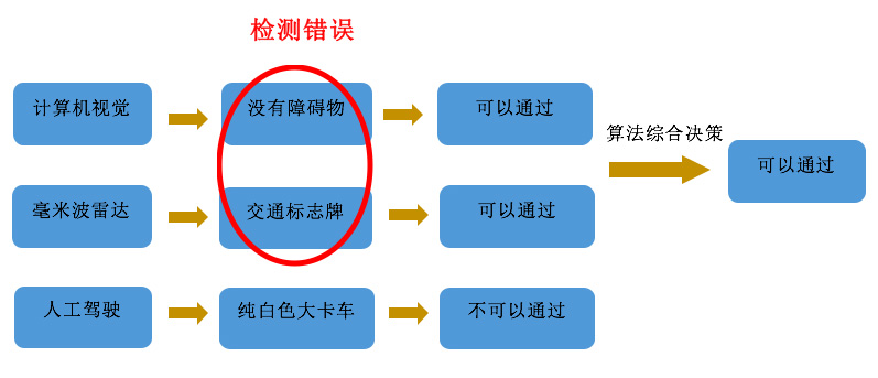 官方解釋為在強(qiáng)烈陽(yáng)光的照射下攝像頭位置偏低,左拐的拖車為白色,且龐大,攝像頭判斷其為一朵白云,可以通行,毫米波雷達(dá)則測(cè)算出前方有一個(gè)巨大障礙物,但是因?yàn)榭ㄜ囘^(guò)大的反射面積,以及過(guò)高的車身,讓它判斷為交通指示牌,可以通行,攝像頭和雷達(dá)做出不同的判斷,但是都選擇可以通行,終造成事故的發(fā)生。