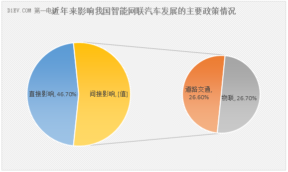 參考2010年~2016年8月的智能網聯汽車相關政策情況,對智能網聯汽車產生直接影響的政策數量達46.7%,主要涉及汽車及汽車零部件;間接性影響的政策數量則為53.3%,主要涉及汽車道路交通、物聯網等,暫未過多涉及通信等領域。