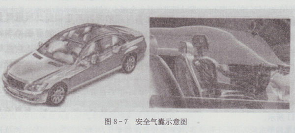 駕駛員處的安全氣囊是存放在轉向盤襯墊內的,因此當看見轉向盤上標有“SRS,,或“~irbag’’字樣,就可知此車裝有安全氣囊。安全氣囊系統主要由傳感器、微處理器、氣體發生器和氣囊等主要部件組成。傳感器和微處理器用以判斷撞車程度、傳遞及發送信號。氣體發生器根據信號指示產生點火動作,點燃固態燃料并產生氣體向氣囊充氣,使氣囊迅速膨脹。安全氣囊示意圖如圖8—7所示。