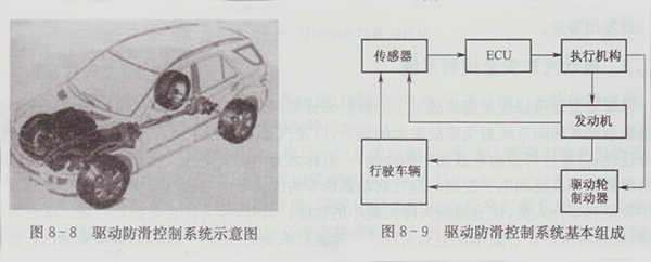 電動汽車驅動防滑控制系統(Anti Slip Regulation,ASR),是應用于汽車防滑的電子控制系統。驅動防滑控制系統示意圖如圖8—8所示,驅動防滑控制系統基奉組成如圖8—9所示。