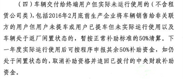據此可以推測,近日流傳出的“閑置車輛信息參考表”即為2016年9月專員辦檢查及各地方政府復查出的“閑置車輛”信息匯總。此番再次發布《關于報送2015年度新能源汽車閑置車輛情況的通知》,是要求對認定為閑置情形的車輛運行情況進行核查確認。而后,四部委會根據反饋信息形成終關于“閑置車輛”問題的確定,并按照出售對象是關聯企業而非終端用戶且閑置的車輛不予以清算,對出售給非關聯用戶但處于閑置狀態的車輛按正常補助的50%進行清算。