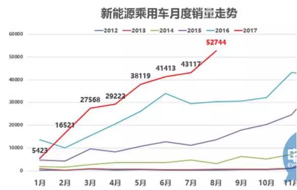 據乘聯會的數據,2017年8月新能源乘用車銷量創有史以來單月銷量新高,達到52744臺,環比7月增長1萬臺,同比增速72%。