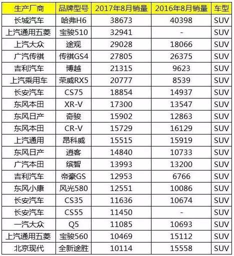 SUV銷量排名
