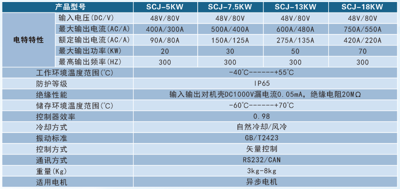 SCJ系列是針對叉車開發的交流異步電機控制器。應用了先進的矢量控制算法和新MOSFET驅動技術,采用CAN總線或無線藍牙通訊方式,可通過電腦或手機平臺對控制器實現編程及監控;本機具有電機自動匹配功能,能使電機以佳的效率運行;具備短路、過載、過溫、高低壓等多重保護功能。