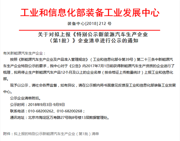 9月3日,工業和信息化部裝備工業發展中心發布了一則“關于對擬上報《特別公示新能源汽車生產企業(第1批)》企業清單進行公示的通知”(以下簡稱《通知》),對于《公告》內2017年7月1日前獲得新能源汽車生產資質的企業進行了梳理,對停止生產新能源汽車產品12個月及以上的30家企業在9月3日-9月9日期間進行公示,如企業在公示期內未將書面意見反饋,將上報至工業和信息化部。