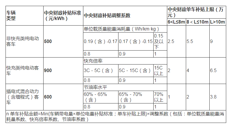 (一)新能源客車補貼標準。具體如下: